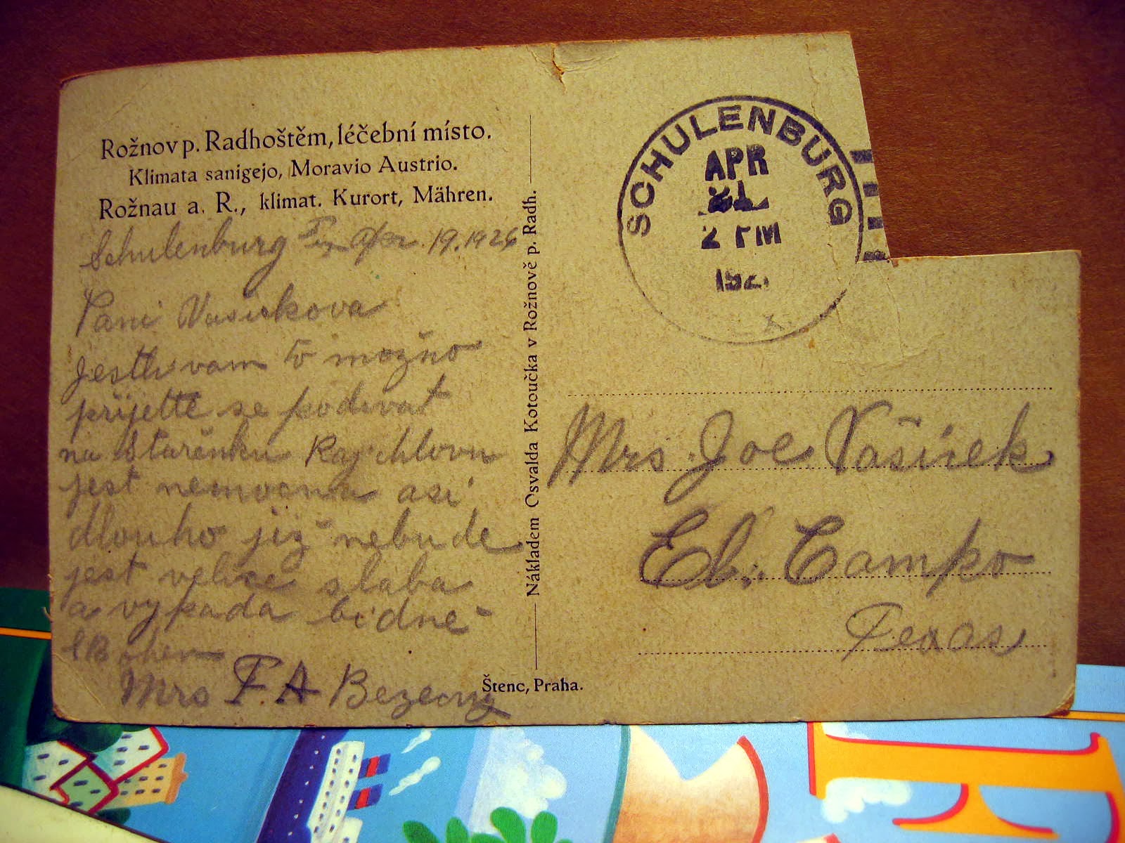 Wordless Wednesday: Postcard in Czech to my great grandma Betty Vasicek (Elizabeth Agnes Michna) from the Czech Republic Posted on 22 January 2014 by Kate Challis