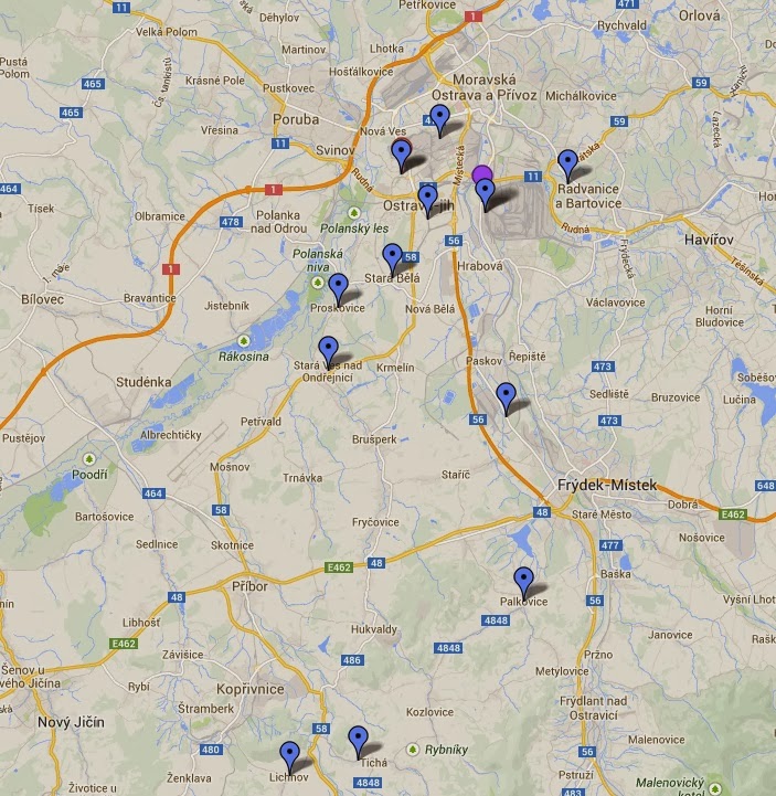 I plotted where I *guess* that most of these places are on a map. You must remember though, Czech village of origins can be tricky because there are a lot of places with the same name – and some are very close to each other. However, I think my guess is an educated one, given that I have been studying my own ancestors who were part of the original Dubina-Hostyn-Ammannsville Texas Czech settlers, as well as those that followed soon thereafter.