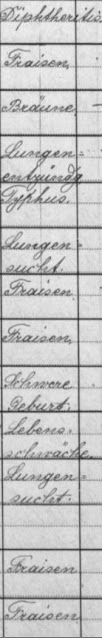 On one half of the register, the cause of death appears as “Fraissen” with two s’s.