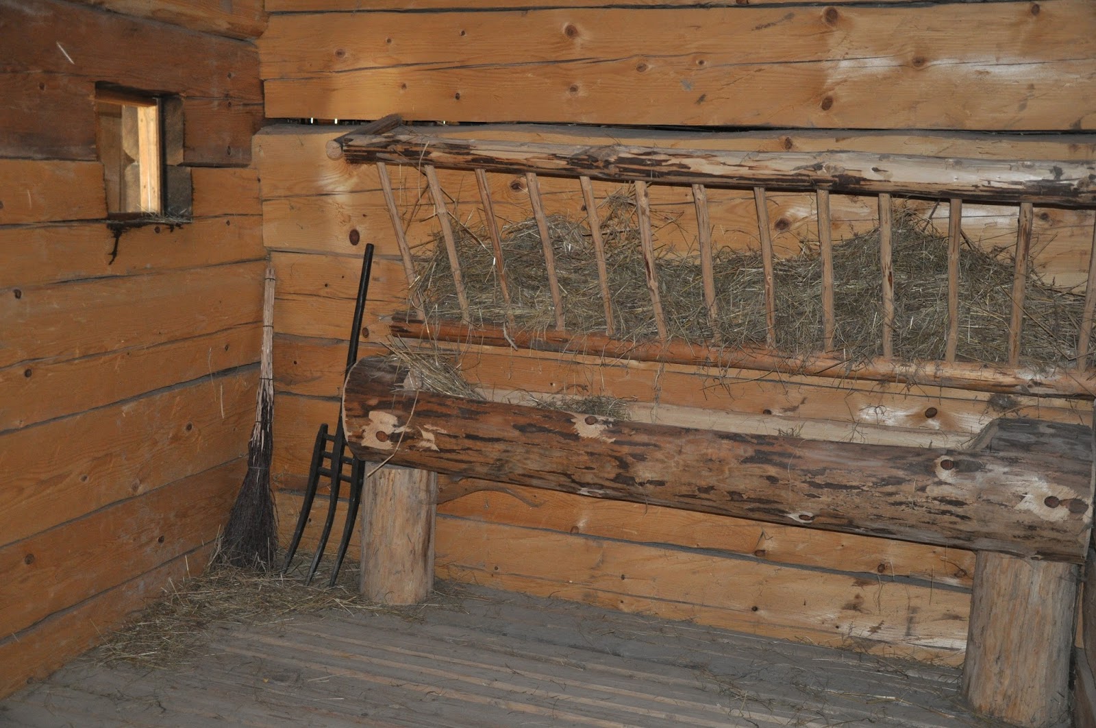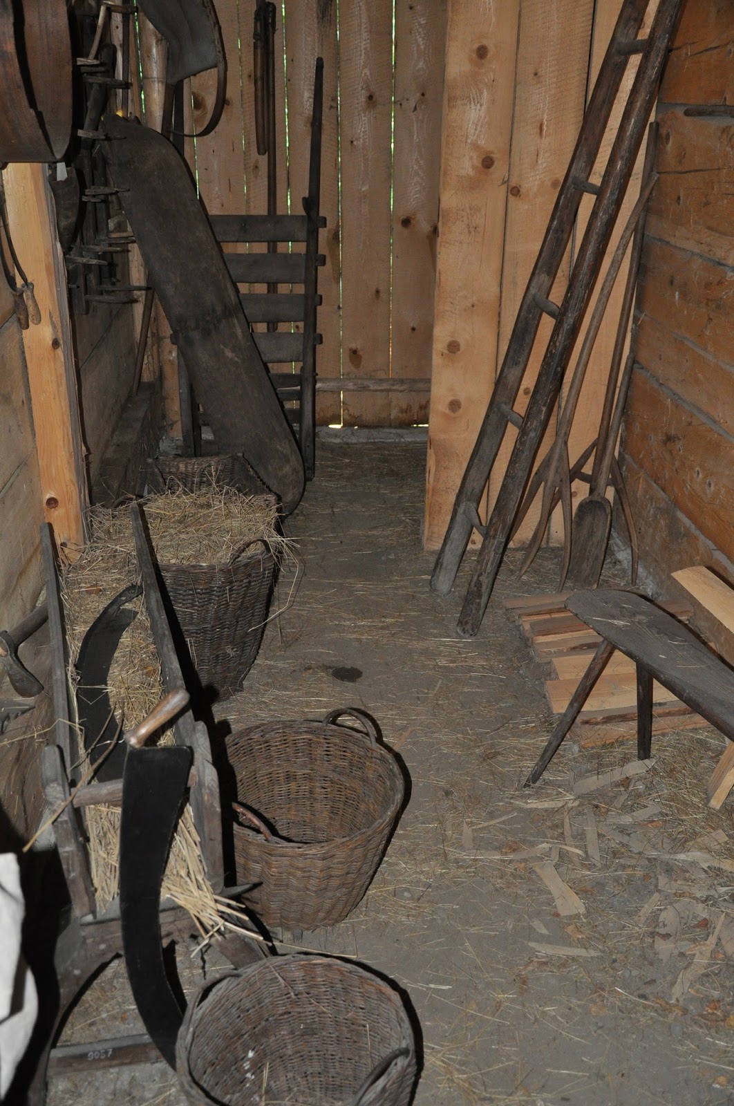 The agricultural background comprised a pigsty where the cow was also kept. A young calf was often taken into the room. There was a designated place near the oven. In the rear part, behind the sty and chamber, a small barn was added. Farming equipment and the woodcutter’s tools were stored there (saws, axes, wedges and clubs). There is an interesting item here, the stool used when straw was processed for fodder. The log hut on the opposite side was used for the pig. The corridor between the pigsty, the lavatory and the cottage was used as a storage area for tools. They were suspended on the walls.