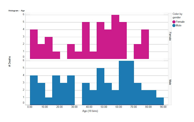 Here is the data if you remove all the deaths for children aged 4 and younger. My husband says that there needs to be more data in order to truly see a curve; that 45 female deaths and 54 male deaths does not give you enough data points. You can see the curve more clearly here. It’s so interesting that the mortality rate spikes for women in their early 40’s. Maybe this is due to complications with pregnancy; it is true that the older you are, the more likely you are to have birth-related problems. Doctors today label any pregnancy for a woman over 35 as “high risk.”