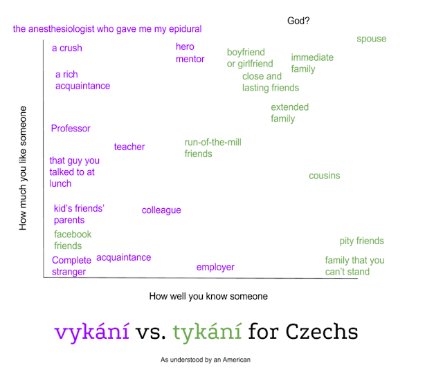 I know that it's true, what you say about Czechs being patient and not expecting me, a foreigner, to really "get" it. But I want to get it. There is not really a specific point at which you achieve linguistic/cultural fluency; "it's not the destination, but the journey that matters," and other such platitudes. I wrote this mainly to figure out *why* precisely it made me feel so incredibly awkward that it even made me blush to imagine having to do this ever (even if I never really will…though…that is the plan…). I also thought my Czech friends/associates would find it mildly interesting.