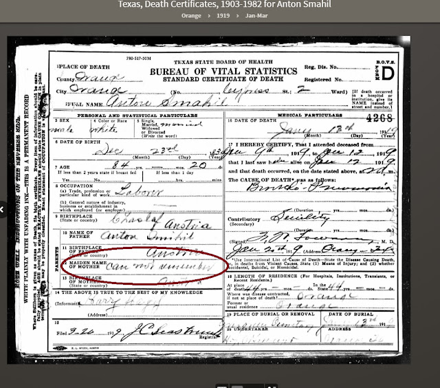 This is so sad to me, that in one generation the name of his parents could be completely forgotten. This is a rare example of a Texas Czech death record having a hint to the village of origin – “Chaslaf”? But it is really sad that the mother’s name is forgotten.